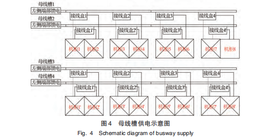 端部饋電模塊由每一列機柜對應(yīng)的主備供母線槽各配置1個接入配電盒,與主干母線槽的插接箱間采用電纜連接。