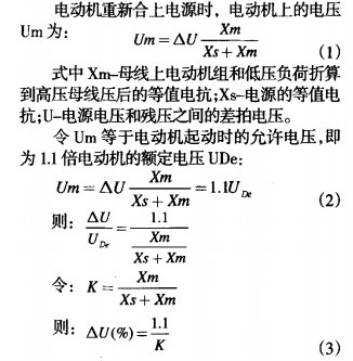 圖1所示為母線槽系統(tǒng)的某一段接線圖,圖2為電動(dòng)機(jī)切換時(shí)的等值電路圖。圖中Us-電源電壓;Ud-母線槽上電動(dòng)機(jī)的殘壓;Xs-電源等值電抗;Xm-母線槽上電動(dòng)機(jī)組和低壓負(fù)載的等值電抗(折算到高壓母線槽壓);AU-電源電壓與殘壓之間的差拍電壓。