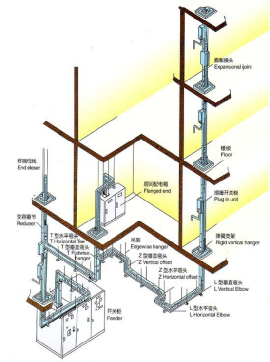前端母線,為電源引入單元,可直接與變壓器或低壓配電屏銜接。變?nèi)萘抗?jié),為母線改換容量時(shí)的過渡節(jié)。