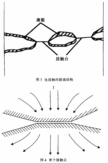 要知道在母線槽聯(lián)接處的電阻,除了母線槽自身存在的電阻外,還存在一個觸摸電阻。這是由于:不論母線槽外表處理得怎樣潤滑平坦,在微觀環(huán)境下,母線槽外表也是高低不平的,如圖3所示,兩片母線槽之間的搭接實(shí)踐上只需母線槽外表上許多小尖峰之間的觸摸,電流流過搭接面的實(shí)踐面積減少了,電流線產(chǎn)生嚴(yán)峻的縮短現(xiàn)象,產(chǎn)生縮短電阻R,取其中一點(diǎn)分析其結(jié)構(gòu)如圖4所示。另一方面,母線槽從加工結(jié)束到裝在開關(guān)柜里有必定的時間差,很簡單由于暴露在空氣里而構(gòu)成一層薄膜(如氧化膜等),使電阻增大,稱為膜電阻R,。所以觸摸電阻實(shí)踐上是由這兩部分組成,即
