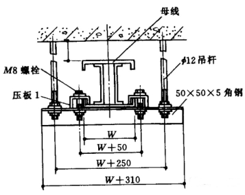 4.3母線(xiàn)槽懸掛吊裝。(圖4、圖5)吊桿直徑應(yīng)與母線(xiàn)槽分量相適應(yīng),螺母應(yīng)能調(diào)理。