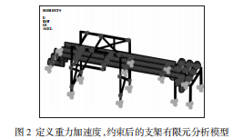 3.4載荷,束縛的模仿界說重力加速度9800mm/s2,在支架立柱底端及其他相應(yīng)方位施加束縛。如圖2所示,為界說重力加速度,束縛后的ANSYS仿真圖。