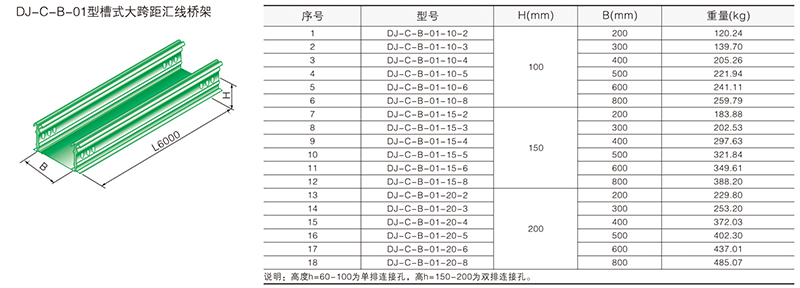 大跨距橋架分梯級式、槽式、托盤式三種型號。A型、B型二種類別,支撐間距為6m,當跨距大于6m時可接受特殊訂貨。
